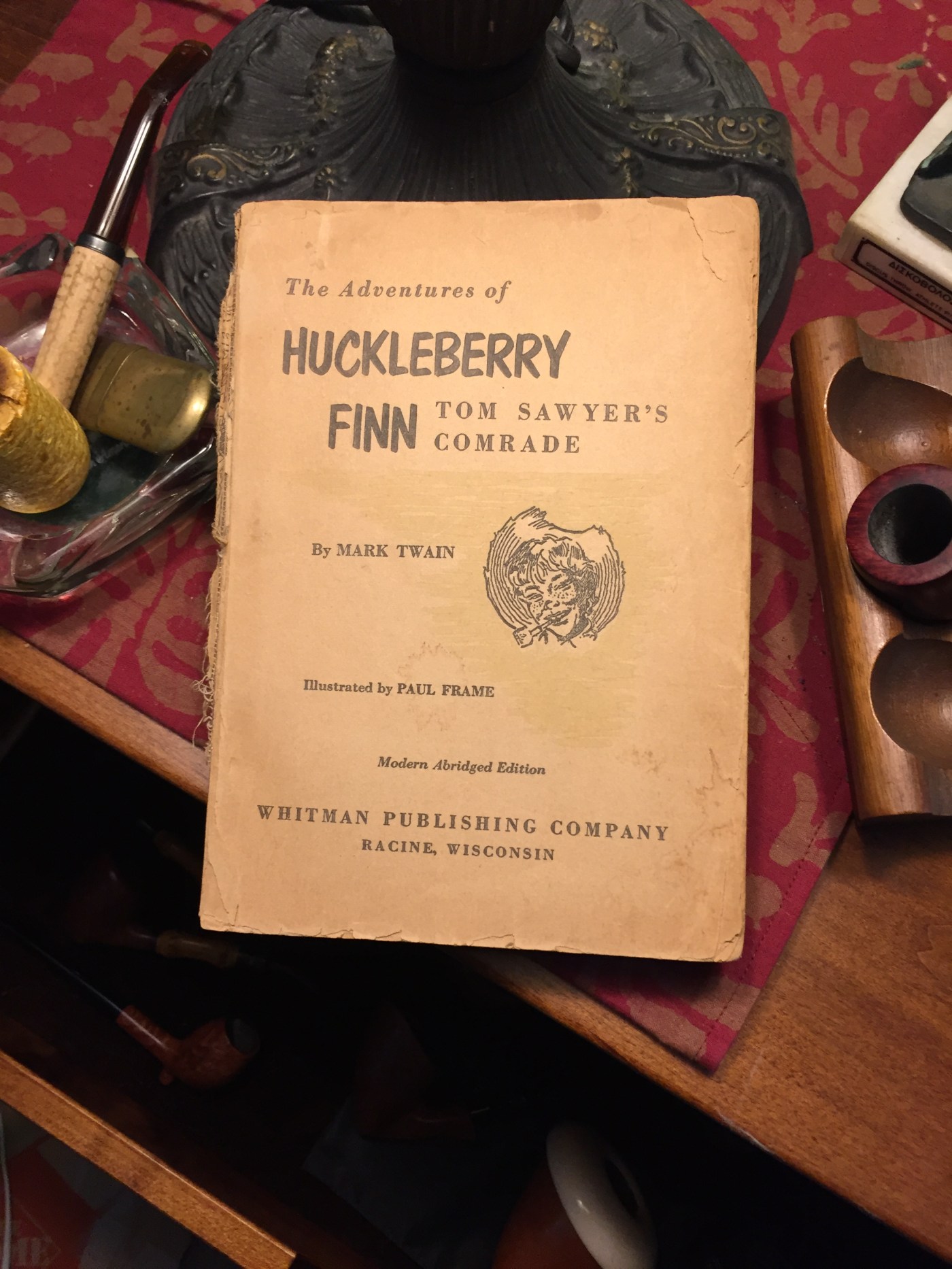 The book itself, a 1950s printing, whose cover was lost to my grubby-handed childhood, came to me sometime after my Mom died. I was four when cancer took her, and much of that time remains blurry to me. But that copy of Twain’s work is one of the oldest of my books that I still have, along side my First Communion Daily Missal. One of my Baker cousins gave it to me. It could have been Sandy or Suzie’s copy, I reckon, maybe even Donna’s, but one of them gave it to me on an overnight I spent at their Main Street home, and I took it away with me. Eventually, I read it or tried to, anyway.